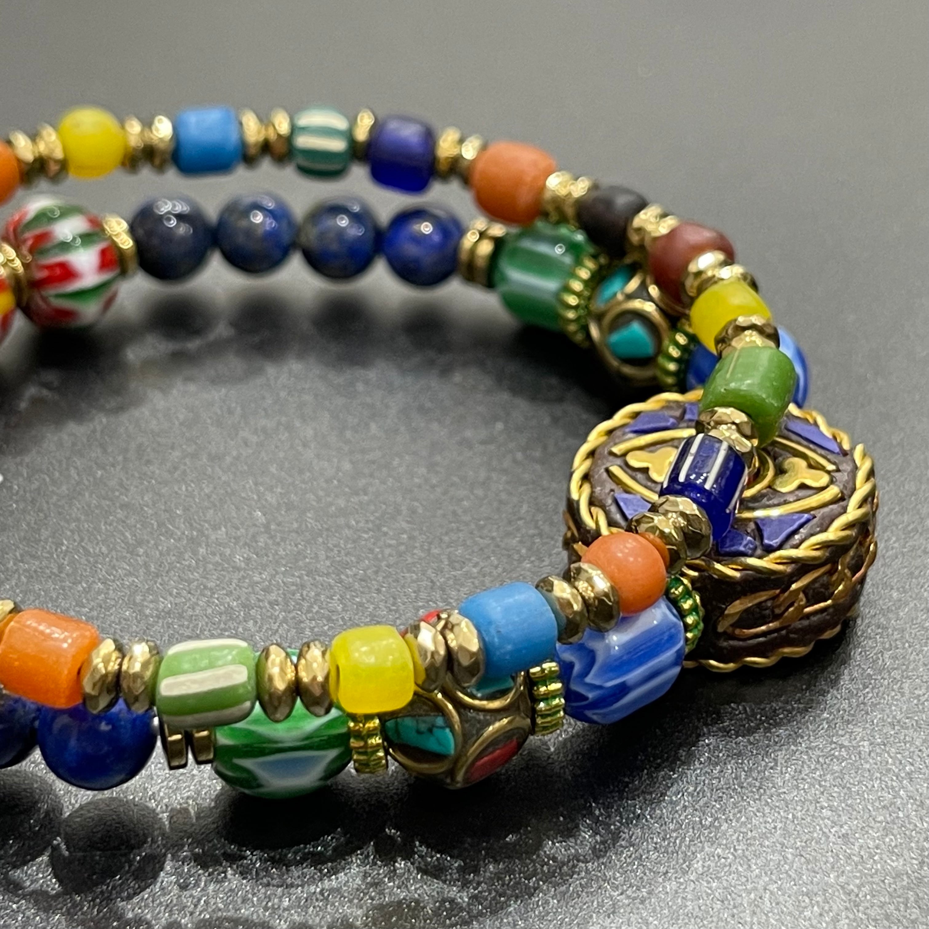 [トルコのお守り]ナザールボンジュウ ネパールアンティークストーンブレスレットⅢ 【ダブル】◇手首サイズ約16㎝