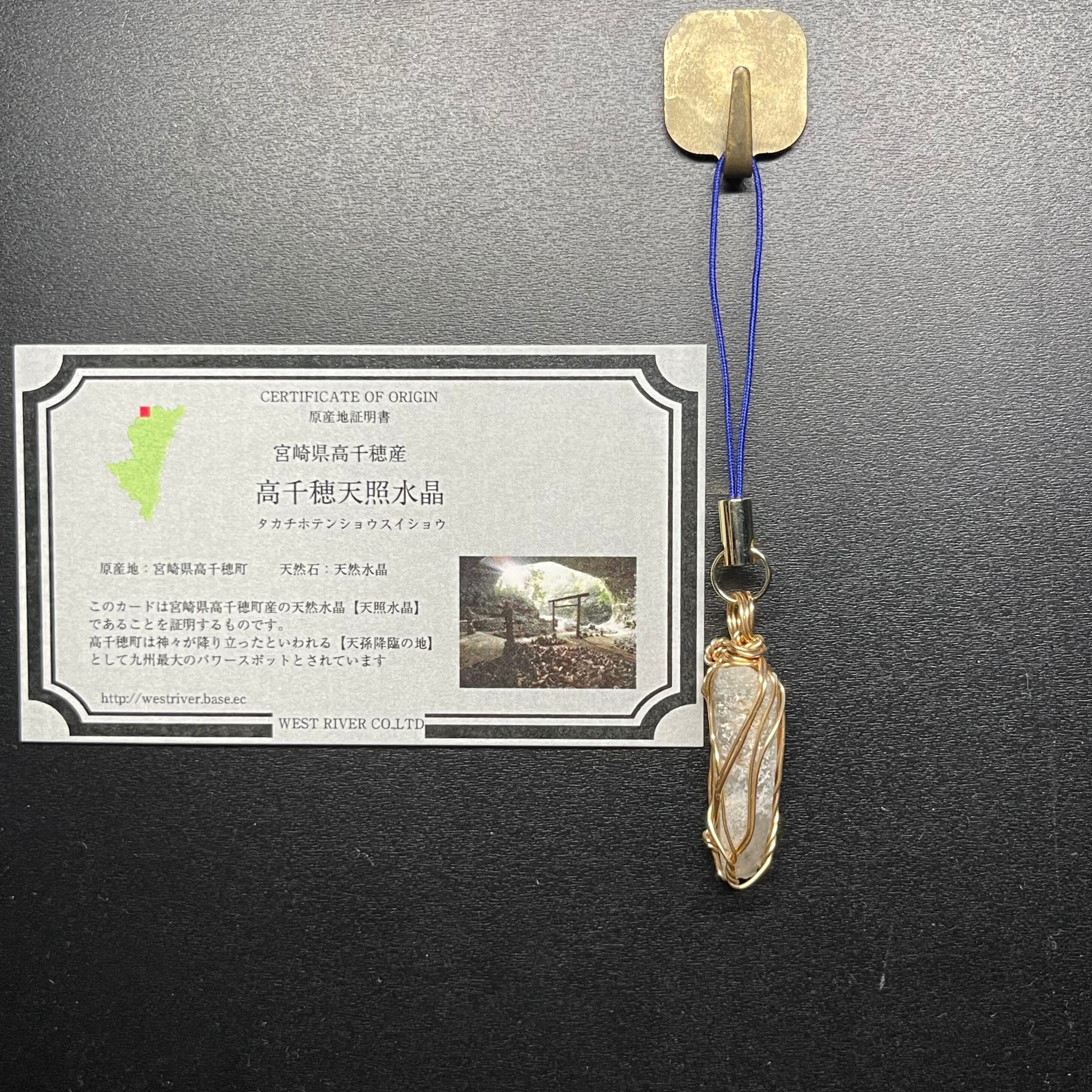 宮崎県高千穂産 高千穂天照水晶ストラップ 水晶27㎜ ◆3.8g◆ 全長90mm ゴールド色