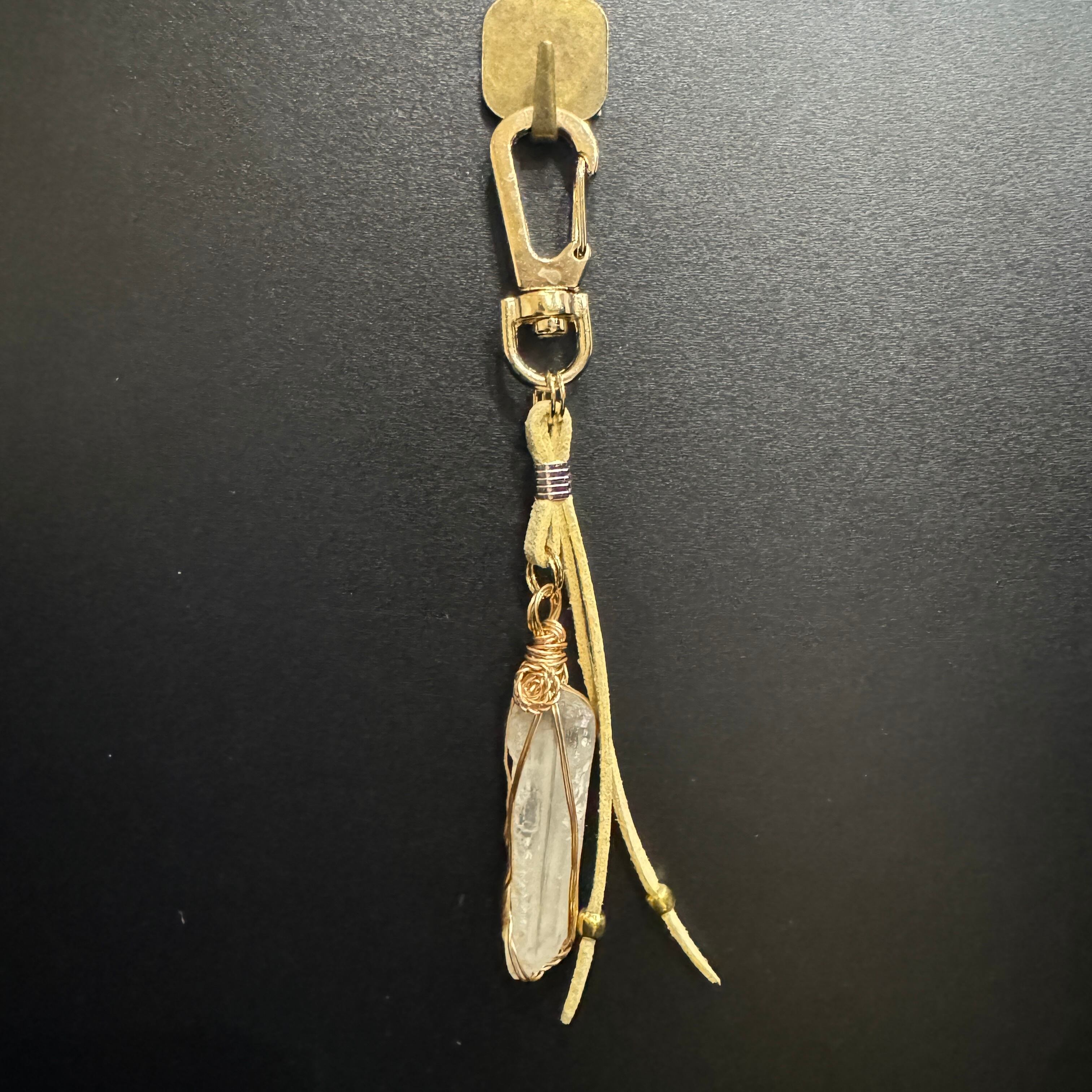 宮崎県高千穂産 高千穂天照水晶キーホルダー 水晶45㎜ ◆13.7g◆ 全長130mm ゴールド色 ライトベージュ紐