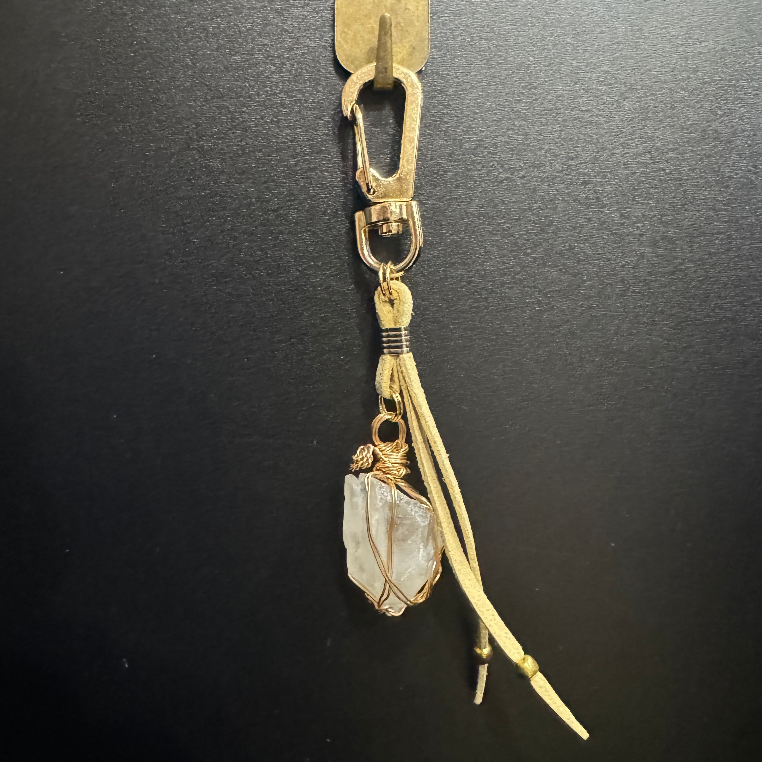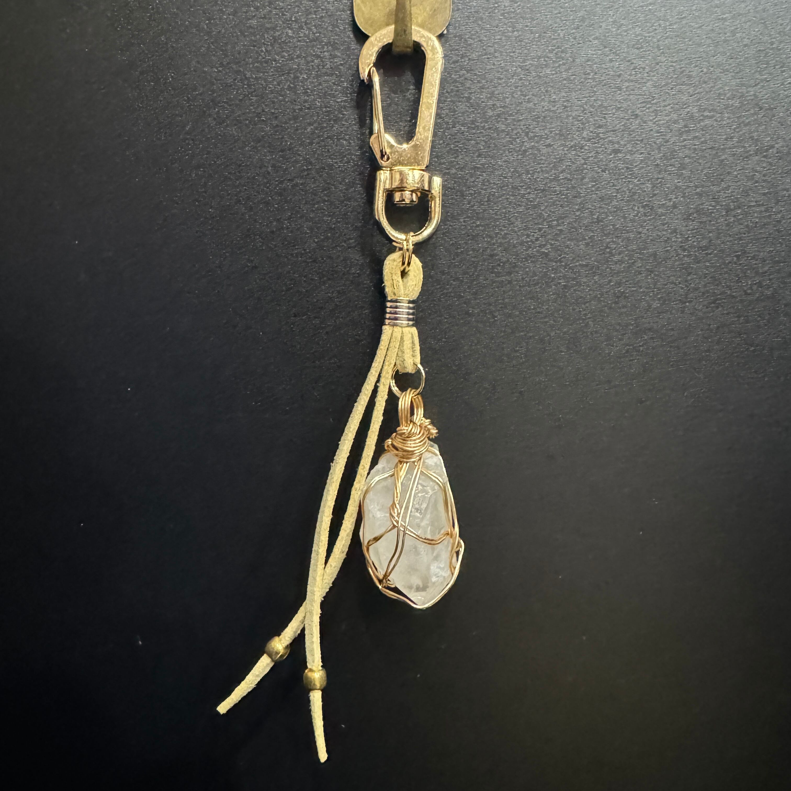 宮崎県高千穂産 高千穂天照水晶キーホルダー 水晶30㎜ ◆18.4g◆ 全長130mm ゴールド色 ライトベージュ紐